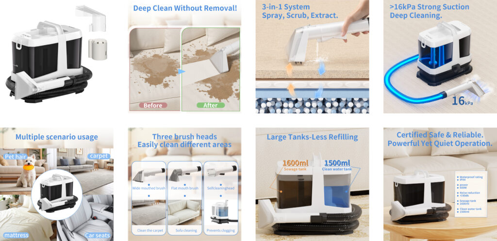Compact and easy to use, the PUNOMO Fabric Cleaner features a user-friendly interface and a flexible hose, making it perfect for cleaning hard-to-reach spots and delicate fabrics. Its modern design and powerful cleaning capabilities offer an eco-friendly, chemical-free solution for homes, offices, and vehicles. Keep your fabric surfaces looking their best with the PUNOMO Fabric Cleaner.