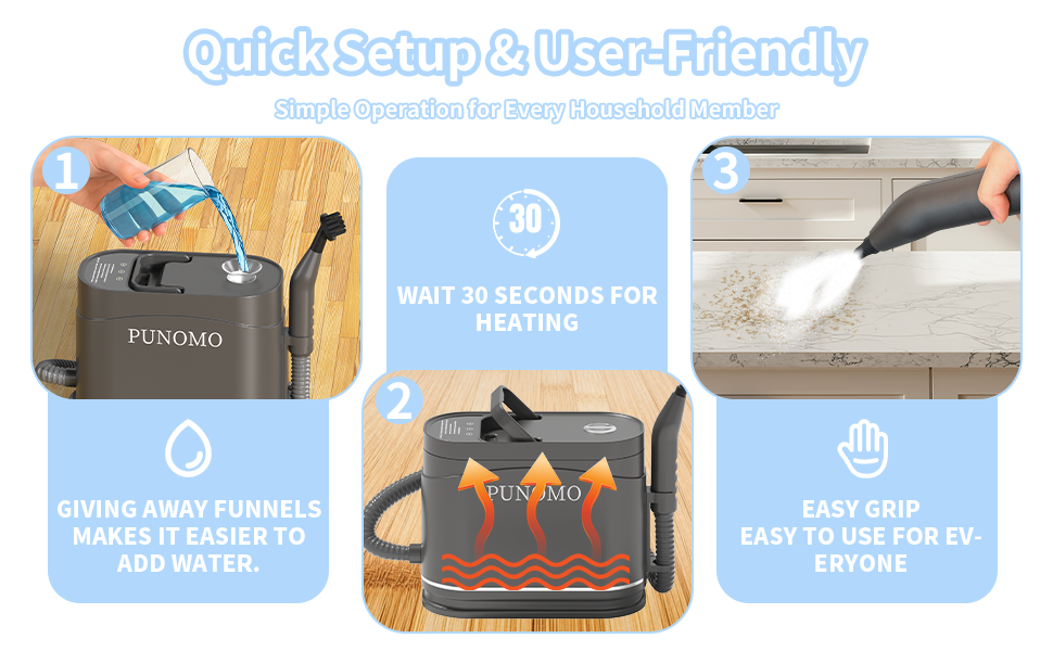 The PUNOMO Steam Cleaner is designed to deliver a superior cleaning experience with the power of high-temperature steam. Perfect for tackling dirt, grease, and stains, this steam cleaner is ideal for both hard surfaces and fabrics. Featuring a lightweight, ergonomic design, it is easy to handle and maneuver for quick and thorough cleaning.